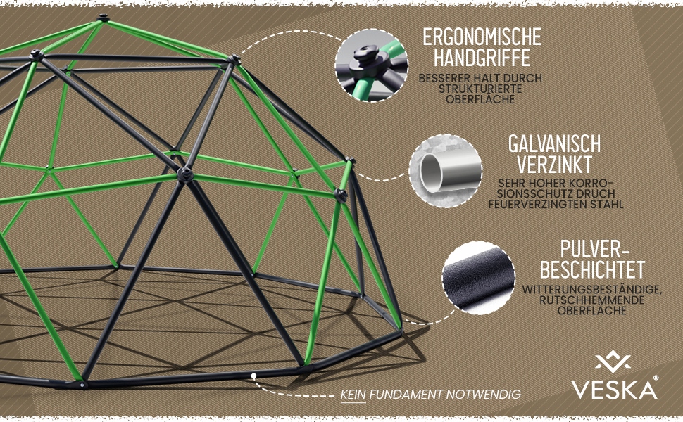 Odporna na warunki atmosferyczne rama wykonana jest z ocynkowanej stali a malowanie proszkowe sprawia, że staje się ona całkowicie odporna na rdzewienie. W ten sposób kopuła może stać przez cały rok na zewnątrz – nie trzeba jej demontować na zimę. Dodatkowo powłoka proszkowa działa antypoślizgowo i tym samym zwiększa bezpieczeństwo podczas wspinaczki.